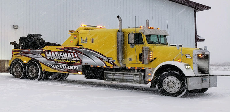 Marshall Truck Sales and Salvage provides 24 Hour Roadside Assistance for heavy duty towing and recovery in west central Minnesota and eastern South Dakota. We are available for scheduled or emergency heavy truck towing with wrecker services available for all your retrieval and recovery needs.
